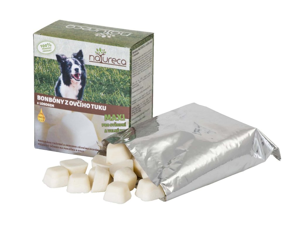 Originálne cukríky z ovčieho tuku s lososovým olejom NATURECA sú prírodným produktom podporujúcim odolnosť organizmu, kvalitu pokožky a srsti, napomáhajú tráveniu a priaznivo pôsobia na činnosť srdca a kardiovaskulárneho systému. Ovčí tuk je chutný doplnok každodennej stravy obsahujúci vitamíny A, D, E, K a omega 3, 6 a 9 mastné kyseliny.