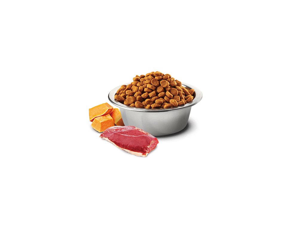 sladký zemiak, kuracíe tuk, sušená tekvica (5%), sušené vajcia,