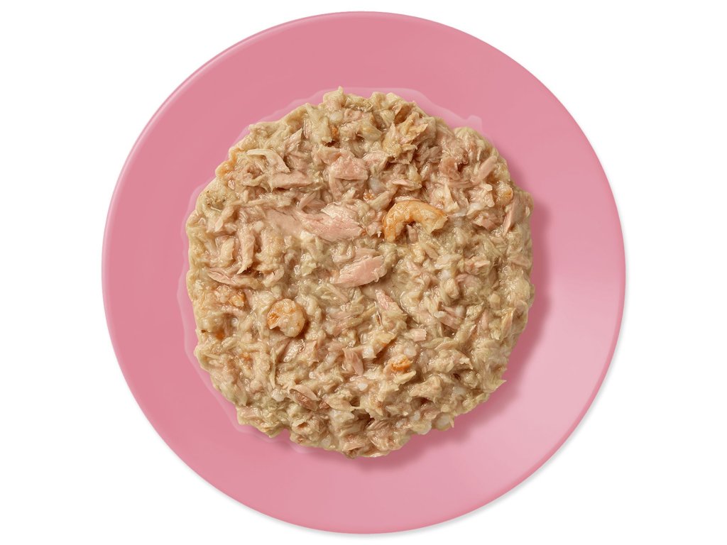 Zloženie: mäso z tuniaka 55%, rybací vývar 23%, tigrie krevety 20%, ryža 2%.