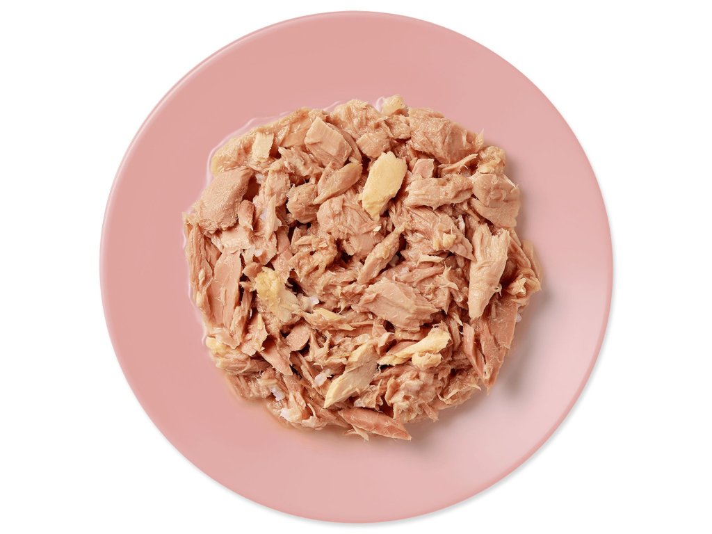 Mäso z tuniaka a lososa v prírodnom aspiku, doplnkové krmivo pre dospelé mačky z prírodných surovín.