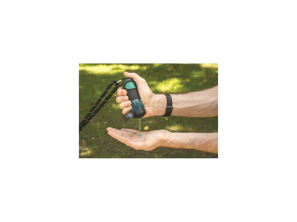 Zásobník na sáčky na exkrementy s antibakteriálnym dezinfekčným gélom na ruky.