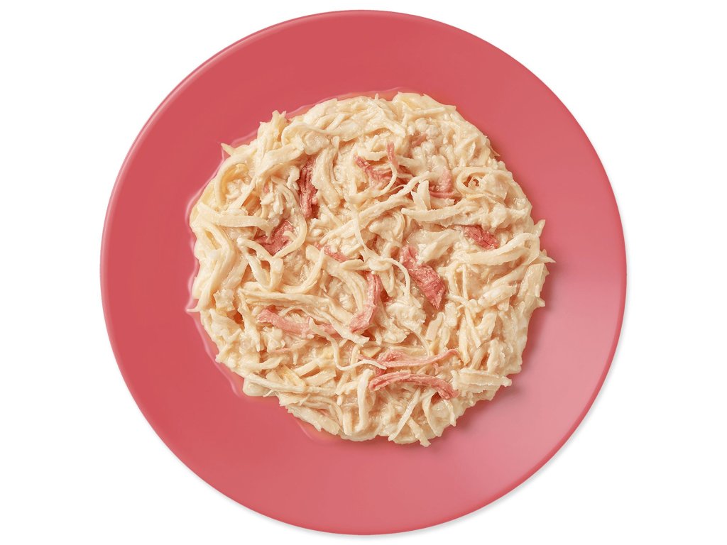 Zloženie: kuracie prsia 70%, kurací vývar 24%, kačka 5%, ryža 1%.