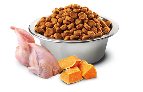 hrachový škrob, sušená tekvica(5%), sušené vajcia, kurací tuk,