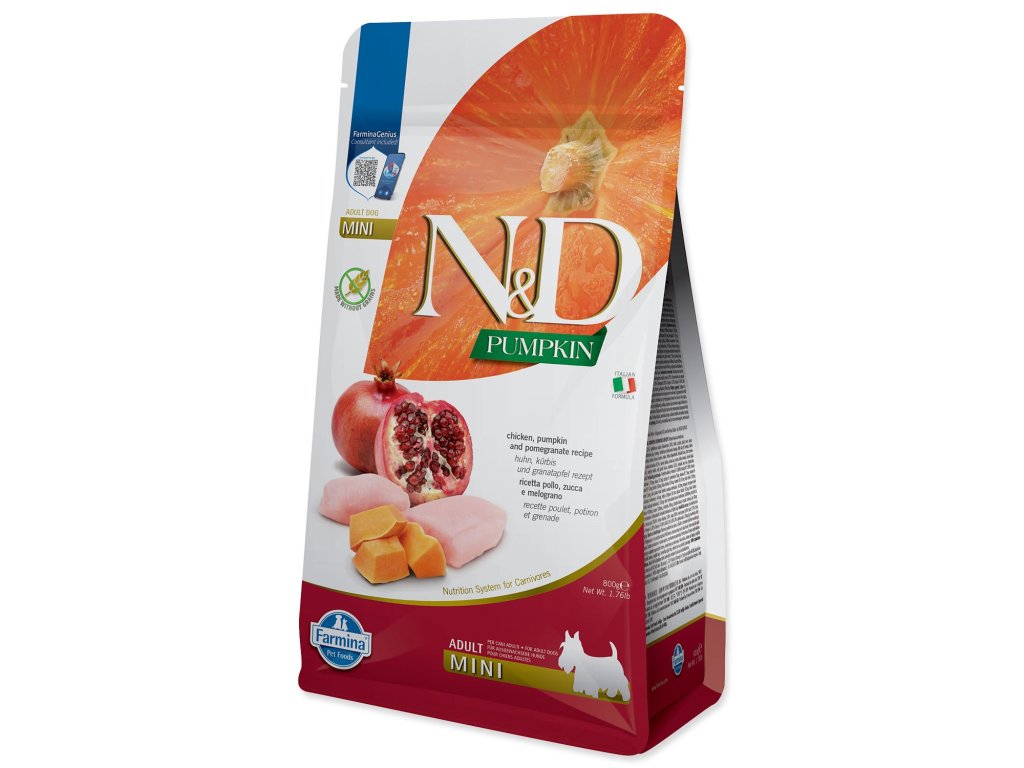 N&D Pumpkin Adult Mini - kuracie mäso, tekvica a granátové jablká. Kompletné krmivo pre dospelé psy malých plemien.