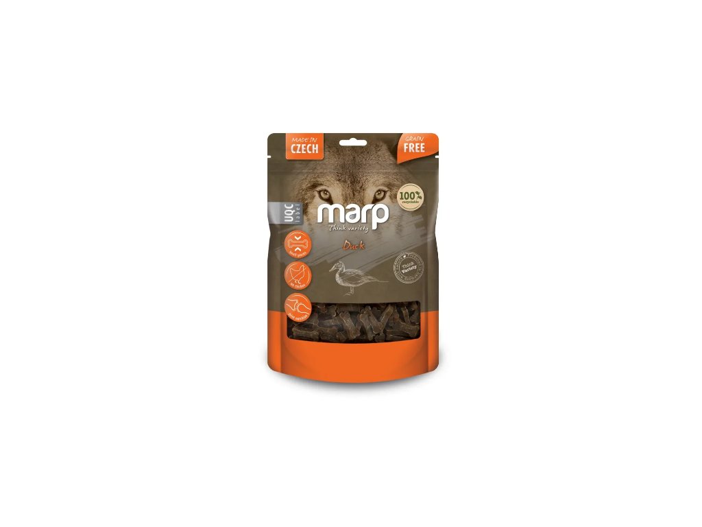 Marp Think Variety – Kačacie maškrty - Vylepšená verzia populárnych tréningových pamlskov! Odmeny obsahujú prírodné suroviny, 50 % mäsa, plus podporujú zdravé kĺby. Pamlsky sú bez kuracieho mäsa. Vyrobené v ČR.