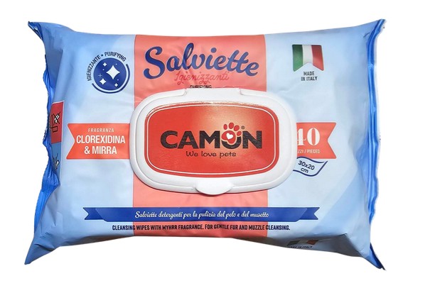 Vlhčené utierky na zvieratá Camon s dezinfekčným účinkom 40ks sú praktický pomocník na rýchle čistenie a prevoňanie srsti, labiek a okolia uší a